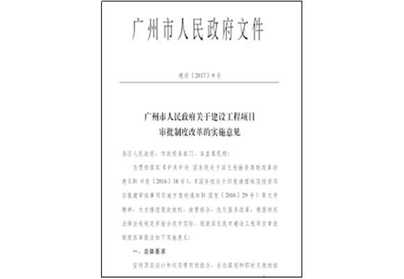 項目亮點 《廣州市建設(shè)工程項目審批制度改革的實施意見》已于2017年由廣州市政府印發(fā)實施。該文件落實中央有關(guān)文件精神,推進簡政放權(quán),放管結(jié)合,優(yōu)化服務(wù)改革。改善企業(yè)投資建設(shè)工程項目審批管理、強化政府投資建設(shè)工程項目全流程管理、推進審批體制機制改革創(chuàng)新。
